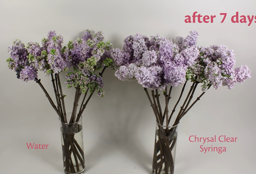 Aşağıdaki grafik, Chrysal Syringa^nın, Leylakların vazo ömrü üzerindeki etkisini yalnızca suyun kullanıldığı durumla kıyaslayarak göstermektedir.