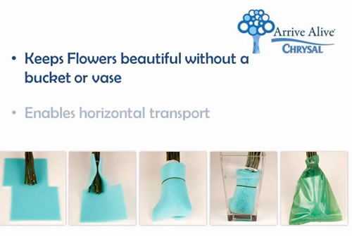Çiçek sapları Arrive Alive by Chrysal ile sarıldığında, taşıma esnasında ve satış noktasında, 3 güne kadar suya gereksinim duymaksızın çiçekleri canlı ve diri tutar. Çiçeklerin su dolu herhangi bir kovaya veya kaba ihtiyaç duymaksızın muhteşem görünümde kalmalarını sağlar. Sadece bu bakımdan bile kullanımı kolay, kullanıcı dostu bir üründür. Orta boy Arrive Alive'in yanısıra, özellikle Avrupalı çiçekçilerin sıklıkla kullandıkları büyük spiral buketler göz önüne alınarak dizayn edilmiş büyük boyları da bulunmaktadır. İster araçların kasalarında, ister kurye veya posta yoluyla gönderilsin, taşıma sonrası bile çiçeklerinizin güzel ve diri ulaşacağından emin olabilirsiniz.