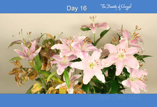 Aşağıdaki grafik, Chrysal Clear L &A ’in , Liliumlar’ın vazo ömrü üzerindeki etkisini yalnızca suyun kullanıldığı duru mla kıyaslayarak göstermektedir.