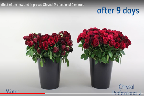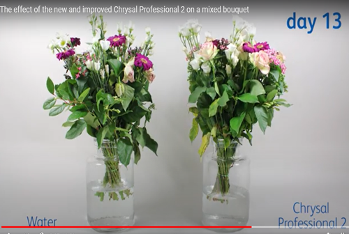 Aşağıdaki grafik, Chrysal Clear Professional 2 Concentrated’in çiçeklerin vazo ömrü üzerindeki etkisini yalnızca suyun kullanıldığı durumla kıyaslayarak göstermektedir.