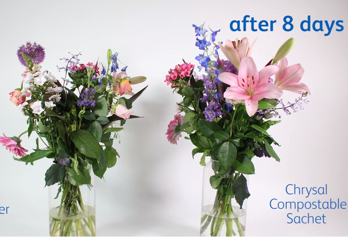 Chrysal’in Recyclable Paper powder sachet çiçek besini, döngüsel ekonomiye katkıda bulunur.
