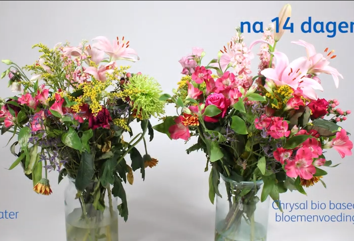 [Metin Kutusu: Vazo ömrü endeksi] Aşağıdaki grafik, yalnızca su kullanımına kıyasla, Chrysal 99% Bio Based Universal çiçek besininin karışık buket aranjmanlarının vazo ömrü üzerindeki etkisini göstermektedir.